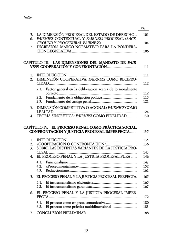 En el plano conceptual, el libro reconstruye la noción de fair trial tal como figura en el Derecho procesal penal contemporáneo. El análisis pone de manifiesto un uso anodino por parte de la literatura y la jurisprudencia, y lo contrasta con la interpretación que la idea de fairness ostenta en la fundamentación de otras prácticas sociales (la comunidad política, el castigo y el deporte). La comparación propicia luego una caracterización ambiciosa del proceso penal, que identifica rigurosamente sus elementos cooperativos, agonales y epistémicos.