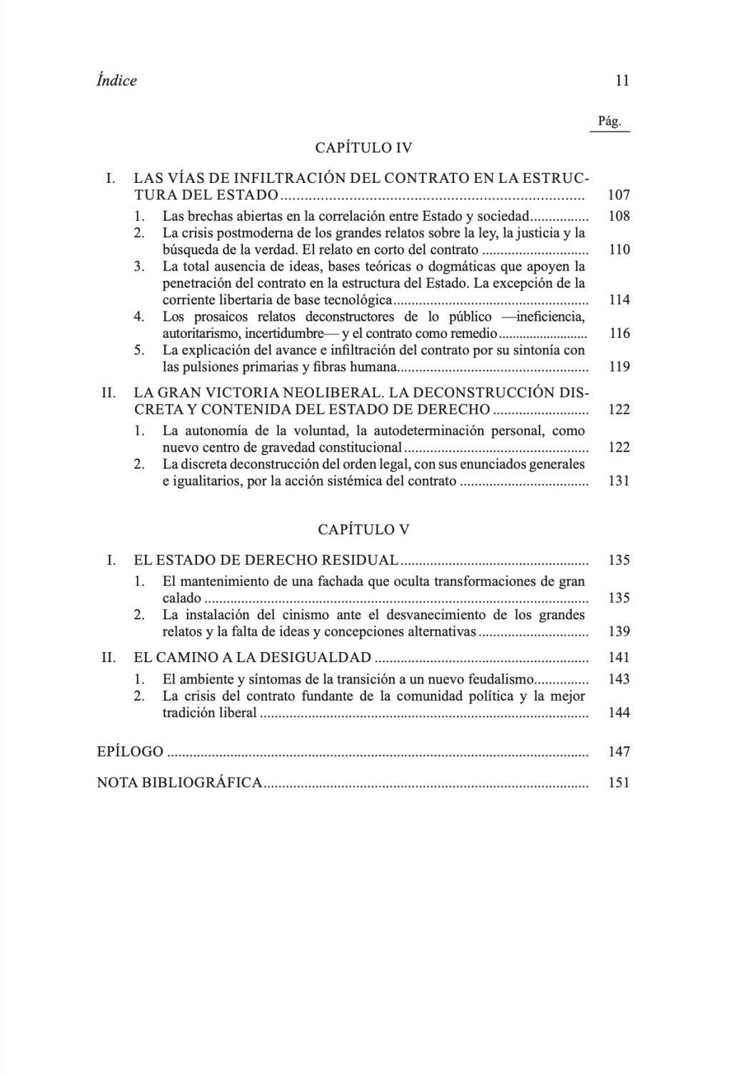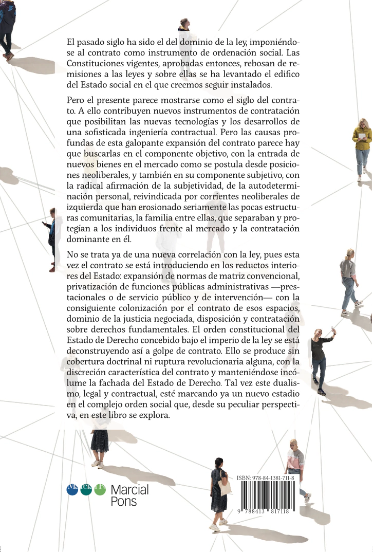 No se trata ya de una nueva correlación con la ley, pues esta vez el contrato se está introduciendo en los reductos interiores del Estado: expansión de normas de matriz convencional, privatización de funciones públicas administrativas –prestacionales o de servicio público y de intervención- con la consiguiente colonización por el contrato de esos espacios, dominio de la justicia negociada, disposición y contratación sobre derechos fundamentales. El orden constitucional del Estado de Derecho concebido bajo el imperio de la ley se está deconstruyendo así a golpe de contrato. Ello se produce sin cobertura doctrinal ni ruptura revolucionaria alguna, con la discreción característica del contrato y manteniéndose incólume la fachada del Estado de Derecho. Tal vez este dualismo, legal y contractual, esté marcando ya un nuevo estadio en el complejo orden social que, desde su peculiar perspectiva, en este libro se explora.