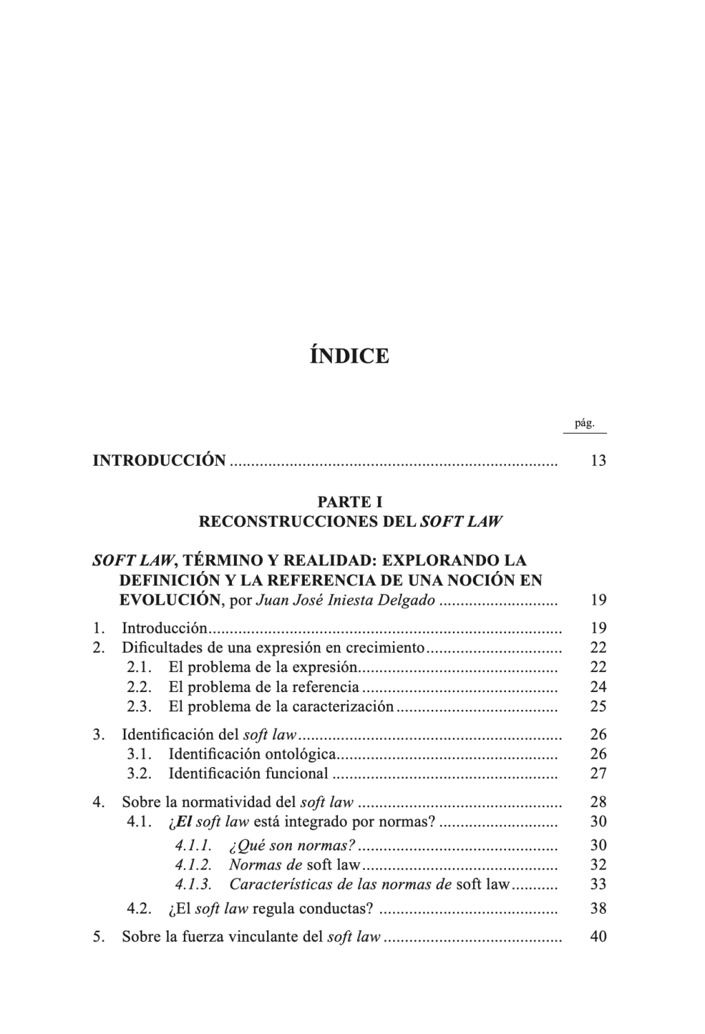 El soft law es un fenómeno que lleva ya tiempo entre nosotros. Sin embargo, aunque hay trabajos que lo estudian con profundidad, es necesario seguir avanzando en su comprensión y análisis. Ello no solo porque se trata de un conjunto de directivas cada vez más presentes en nuestros ordenamientos y con relevancia a la hora de tomar decisiones judiciales y administrativas. También es importante estudiarlo porque pone en cuestión alguna de las intuiciones más básicas que tenemos acerca del funcionamiento de nuestros ordenamientos jurídicos. Normas con un menor grado de obligatoriedad, derecho (o no-derecho) emanado tanto de órganos con competencia para emitir normas vinculantes como de agentes privados, son solo algunas de las cuestiones que es necesario examinar y que el presente volumen aborda. El libro está dividido en tres partes, ordenadas de mayor a menor grado de generalidad y abstracción: mientras que los primeros trabajos toman en consideración en qué consiste el soft law, aquellos de la segunda sección se fijan en cuestiones específicas del fenómeno, dejándose para la última parte específicos estudios sobre concretas ramas del soft law.